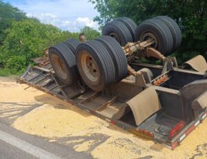 Um semirreboque de uma carreta carregada com milho se desatrelou e a carga caiu na pista. Em seguida, um carro que passava pelo local perdeu o controle e capotou. O motorista morreu no local e a passageira ficou ferida.